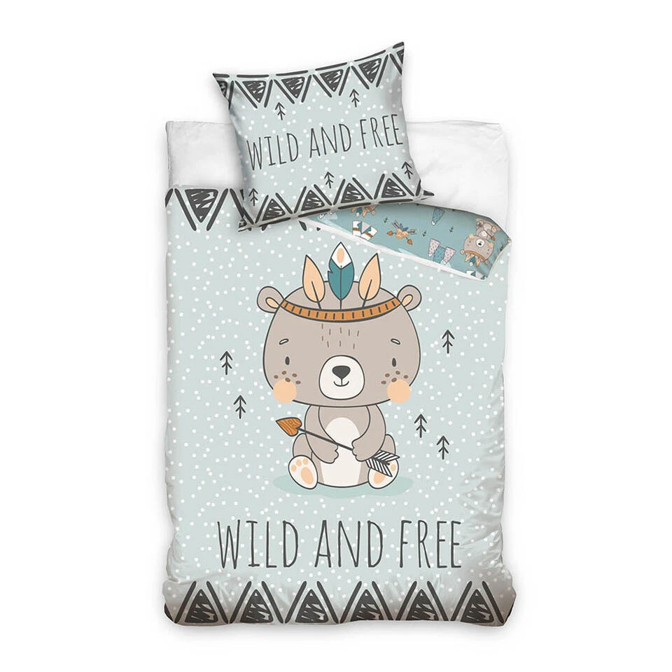 Animal Pictures Dekbedovertrek Wild and Free. Het beertje heeft zich verkleed als een indiaantje met een fantastische verentooi! De achterkant van het dekbedovertrek heeft een verschillend patroon, leuk om bij het opmaken het dekbed daarom een stukje open te slaan. Of gebruik hem tweezijdig. De keuze is aan jou!Â