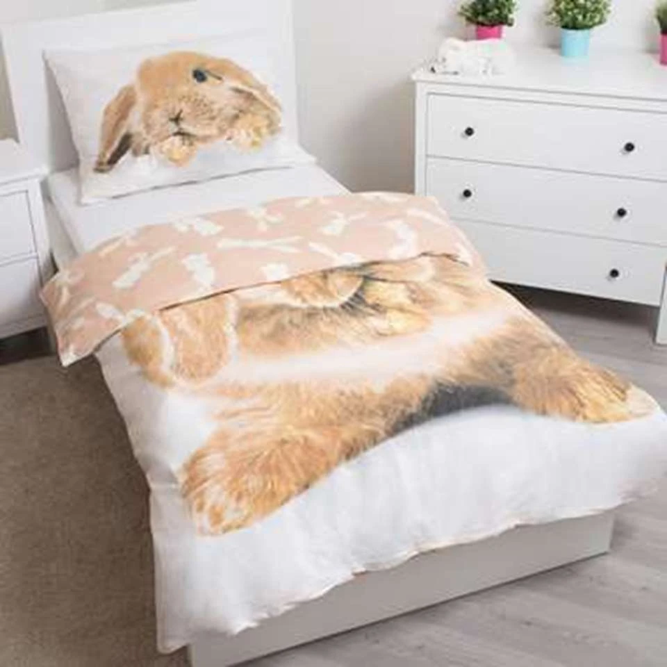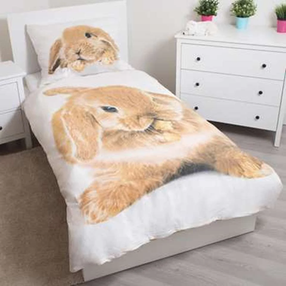 Animal Pictures Dekbedovertek, Konijn. Dit schattige konijntje is zich aan het wassen. Konijnen zijn schone en nieuwsgierige dieren die erg goed als huisdier kunnen worden gehouden. Zit een huisdier er toch echt niet in of kun je geen genoeg van konijnen krijgen? Dit dekbedovertrek is er om in je wens te voorzien. De katoenen stof ademt goed en is heerlijk om onder te slapen. Dit is een leuk cadeau voor een konijnenliefhebber!