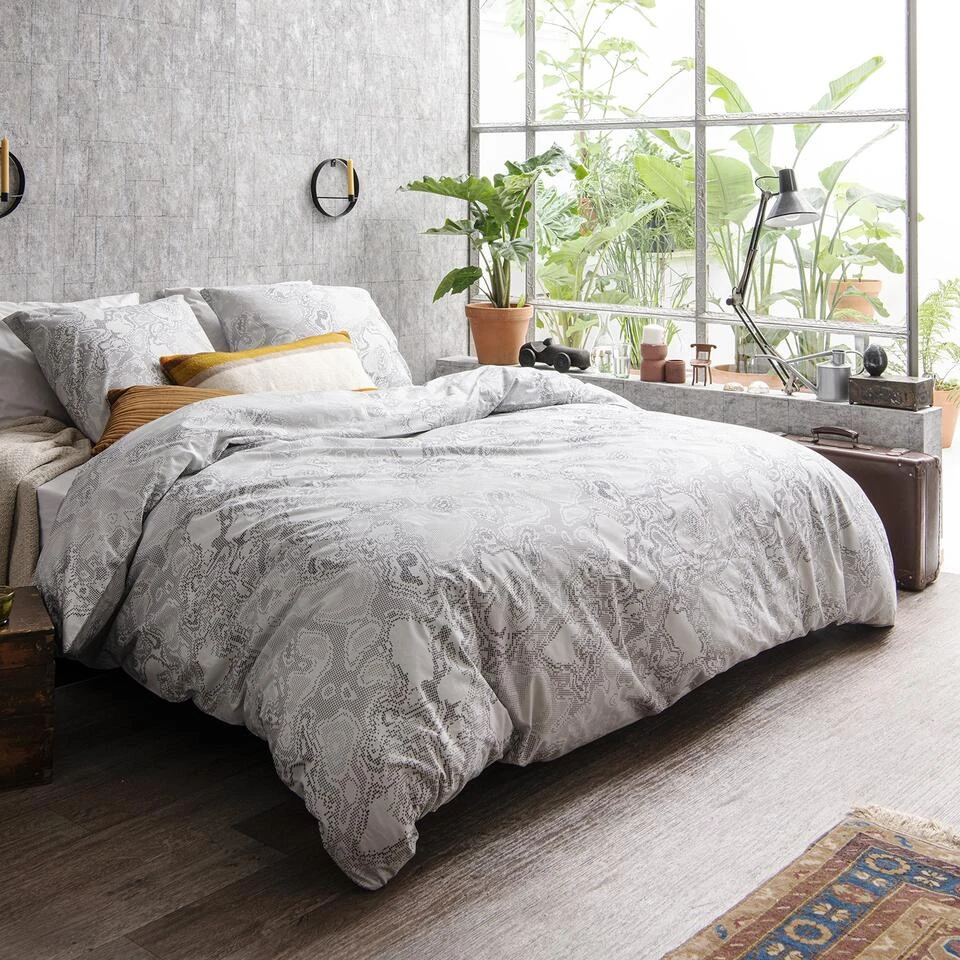 Het dekbedovertrek Charon van Cinderella heeft een all-over print uitgevoerd in een lichtgrijze kleur. Het ontwerp is opgebouwd uit pixels waardoor er een bijzonder patroon ontstaat. Hiermee zet je een strakke en unieke look neer in jouw slaapkamer.