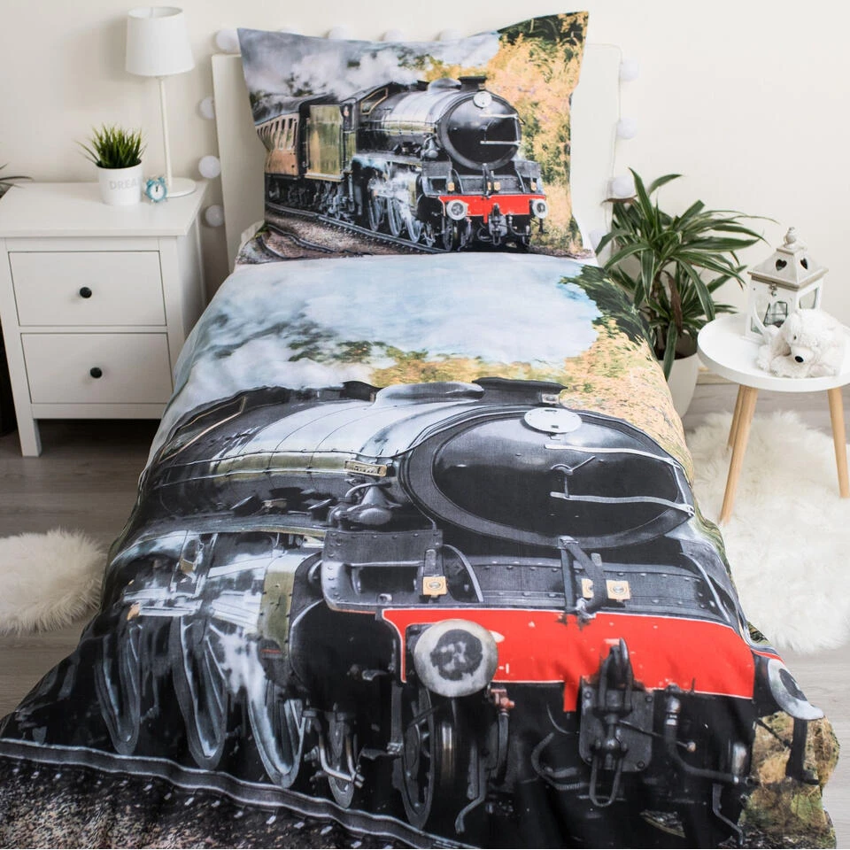 Locomotief Dekbedovertrek, Trein. Of je nu modeltreintjes spaart of zelf graag met de trein reist, met dit gave dekbedovertrek zit je dan zeker goed. Met een mooie afbeelding van een ouderwetse stoom locomotief heb je een echte blikvanger te pakken! Op de achterzijde staat een dessin van getekende locomotieven: Leuk om eens af te wisselen bij het opmaken van het bed. De set is gemaakt van 100% katoen en de kussensloop is extra groot! Ook een leuk cadeau idee voor een echte treinen fan voor een verjaardag of de feestdagen.