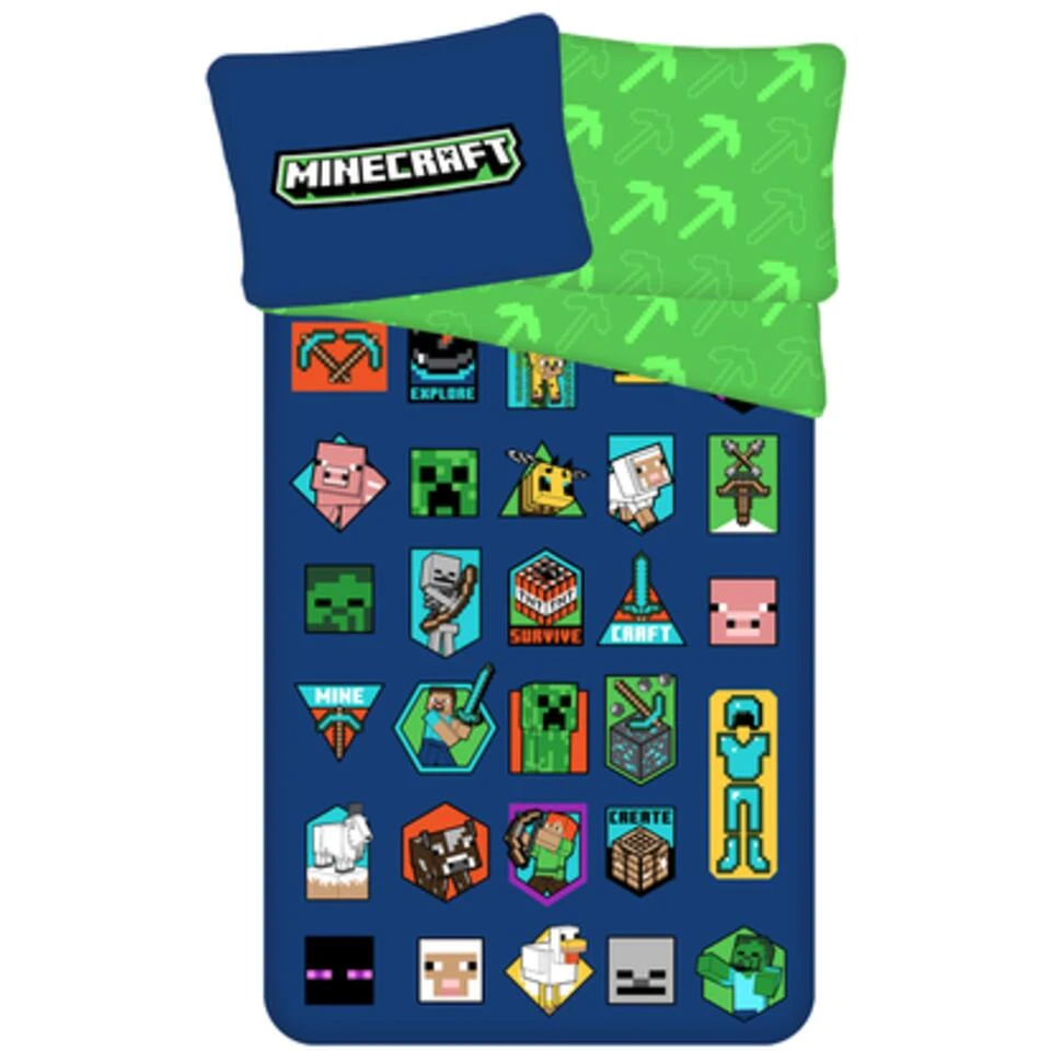 Minecraft Dekbedovertrek Badges. Stoer dekbedovertrek van het bekende spel Minecraft. Ben jij ook urenlang dit spel aan het spelen? Weet jij precies wat een Mob, Creeper, de Overworld of Nether is? Dan is dit hét dekbedovertrek voor jou! Voorzien van toffe afbeeldingen uit het Minecraft spel, waardoor je een echte blikvanger te pakken hebt. Helemaal door de dubbelzijdige bedrukking, op zowel het overtrek als de kussensloop. Leuk om eens af te wisselen met het opmaken van het bed. Een waanzinnig leuk cadeau-idee voor de liefhebber van Minecraft voor een verjaardag of de feestdagen.