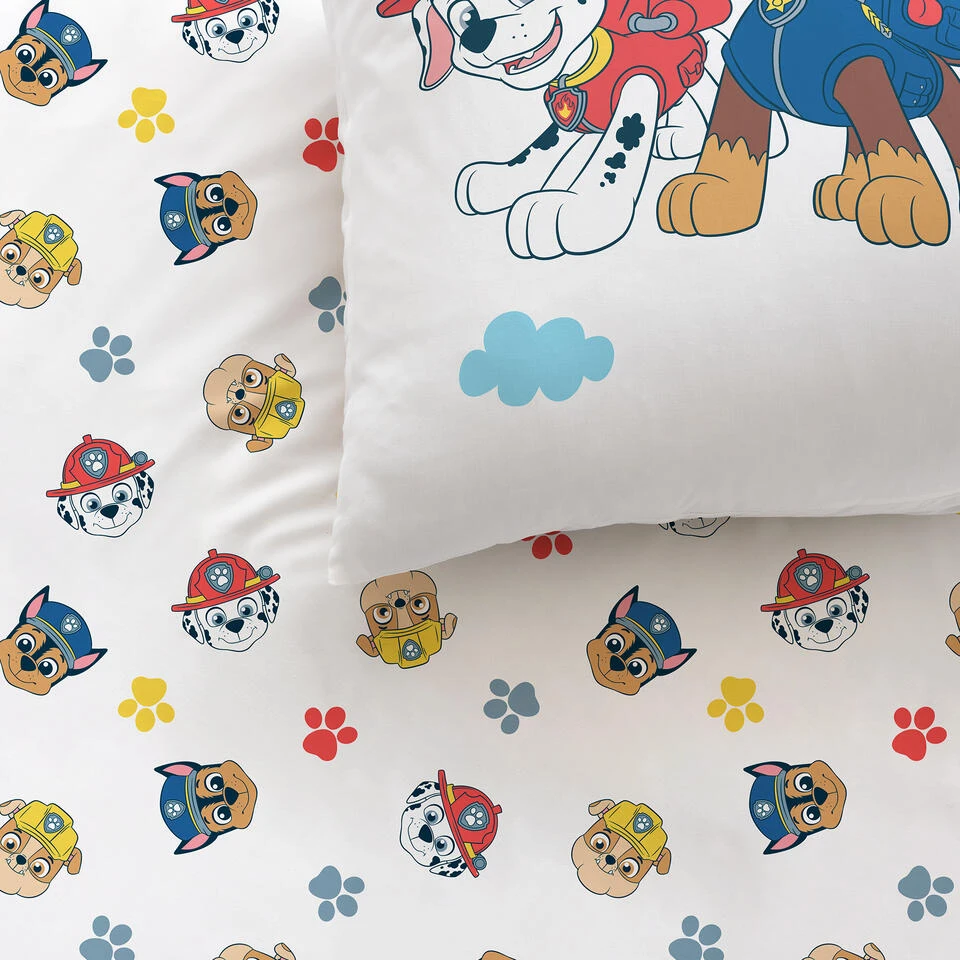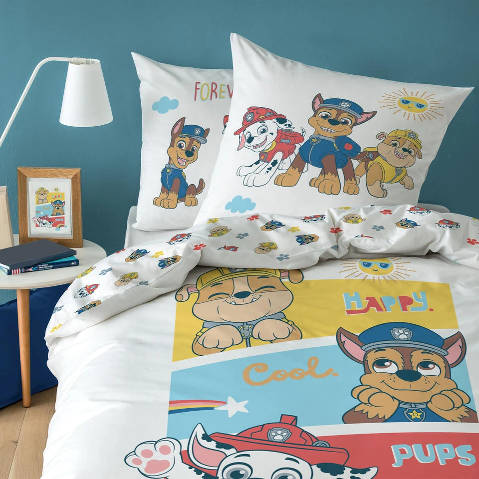 PAW Patrol Dekbedovertrek, Happy. Grappig, katoenen dekbedovertrek van Rubble, Chase en Marshall; de beroemde pups uit de Paw Patrol animatie-serie. Ook fan van deze stoere heldenpups? Dan is deze set een echte must-have! De set heeft een dubbelzijdige bedrukking, waardoor deze op meerdere manieren te gebruiken is. Leuk om eens te variëren met opmaken! Ben je nog op zoek naar een origineel cadeau voor een PAW Patrol fan? Zoek dan niet verder!