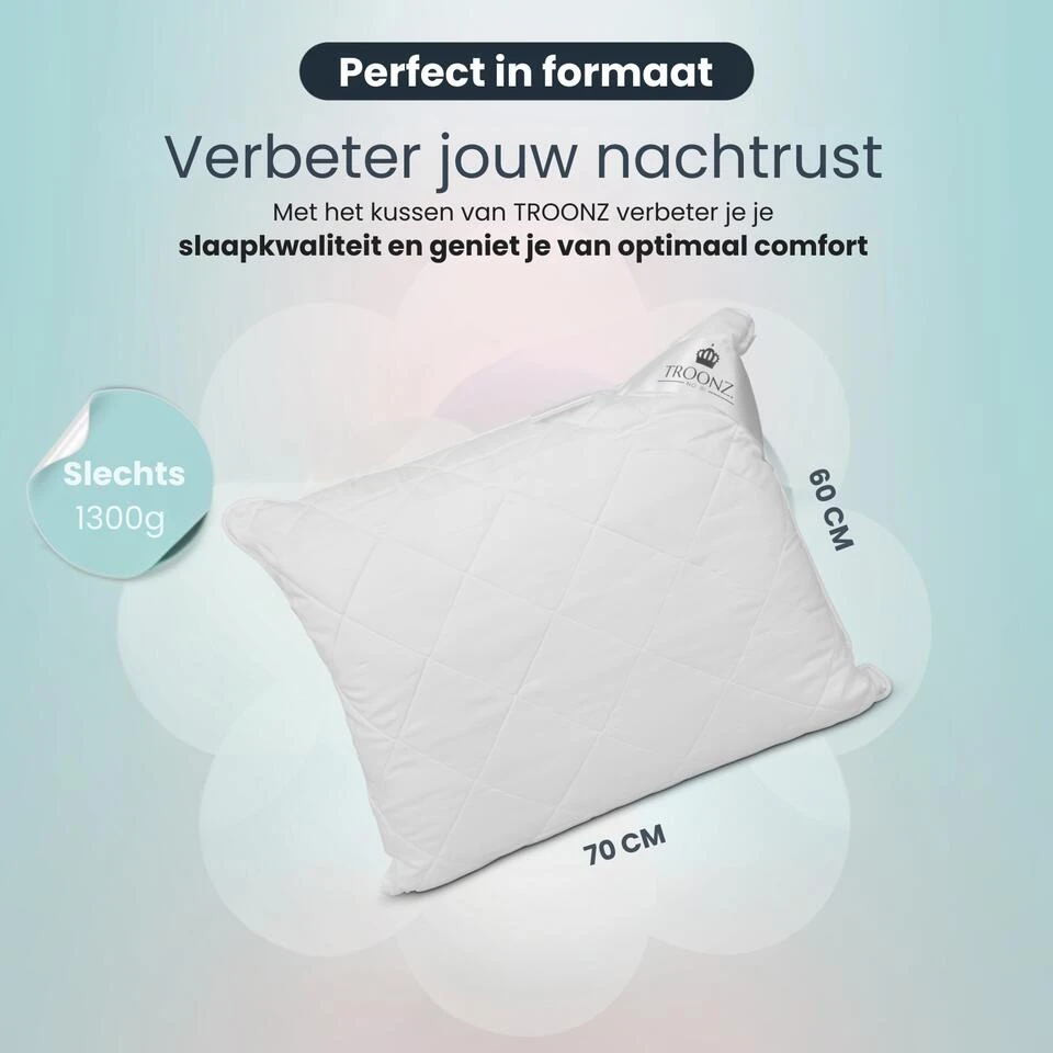 Ben je op zoek naar een kussen dat je een comfortabele nachtrust biedt, zonder pijnklachten? Het Troonz® Six Bamboe Hoofdkussen is de oplossing! Dit ademende hoofdkussen ondersteunt je lichaam optimaal en bestaat uit duurzaam materiaal voor een ergonomische slaapervaring. Voel je weer fris en uitgerust dankzij dit revolutionaire kussen, speciaal ontworpen om je slaap te verbeteren.